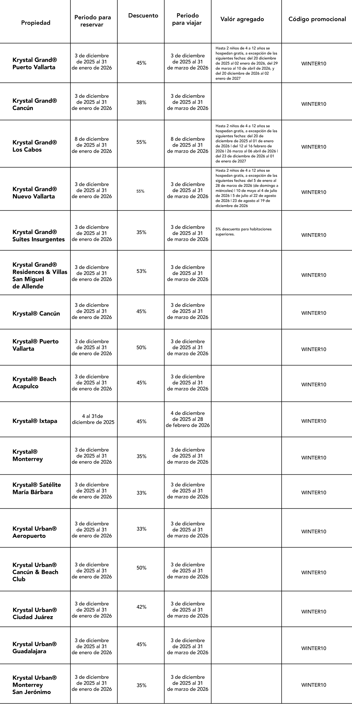 La presente oferta comercial está dirigida a clientes actuales y nuevos de Krystal Hotels & Resorts® quienes podrán reservar obteniendo un 10% de descuento adicional al reservar en nuestra propiedades de Krystal Hotels & Resorts® utilizando el código promocional WINTER10, todo lo anterior sobre las tarifas publicadas en nuestros sitios web oficiales https://es.krystal-hotels.com y en las páginas web oficiales de sus propiedades, tomando en cuenta que dicha oferta comercial deberá pagarse con impuestos, IVA e ISH (impuesto sobre hospedaje).